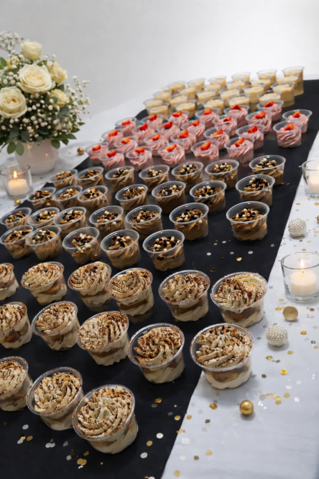 Chocomousse, aardbeienmousse, tiramisu, rijstpap